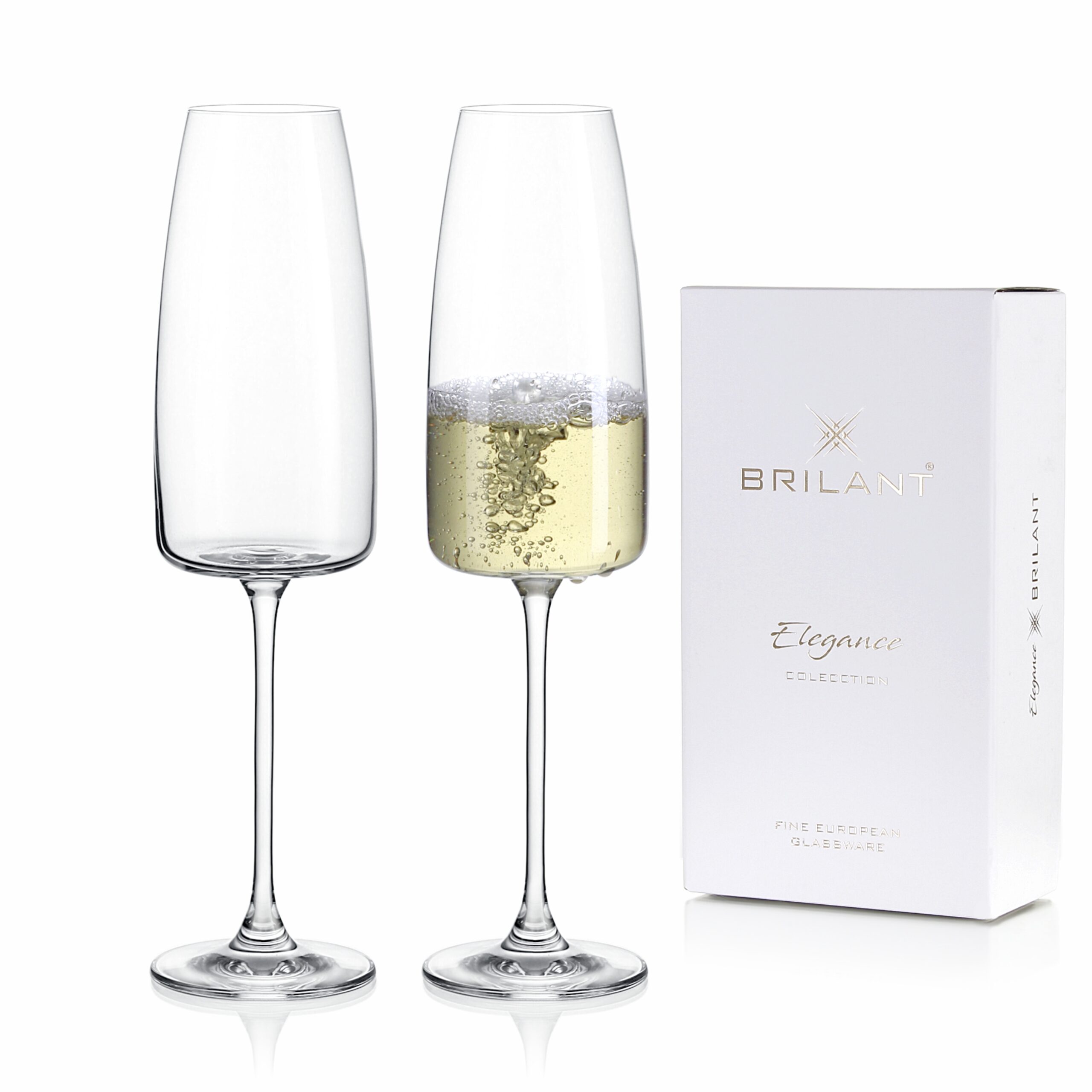 Elegantná dvojica pohárov na stopke určená na podávanie šumivých vín, prosecca a sektu.